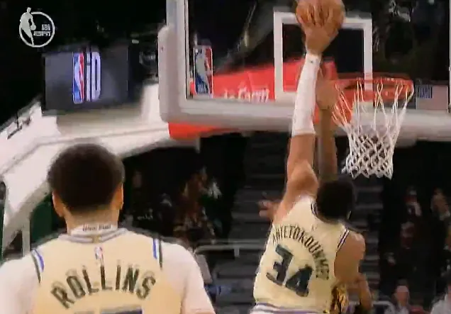 第四节比赛中,字母强攻奥孔古左手隔扣砍下20分,雄鹿末节还落后老鹰12分。